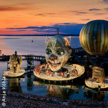 Ein großer Narrenkopf ragt aus dem Bodensee. Sein friedliches Gesicht kann sich in einen lüsternen Frauenverächter und eine schreiende Fratze verwandeln. Seine Halskrause wird zur Spiel?äche für eine ausgelassene Festgesellschaft. Magisch kann der Narr seine rechte Hand bewegen, während seine linke das untere Ende eines riesigen Ballons fest umklammert. Philipp Stölzls und Heike Vollmers wagemutiges Bühnenbild präsentiert Giuseppe Verdis Oper zwischen schaurigem Spektakel und innigem Kammerspiel.