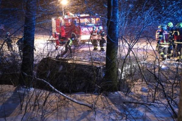 Pettenbach : Auto im Bach - Mutter und Kinder überstehen Unfall auf schneeglatter Straße fast unverletzt