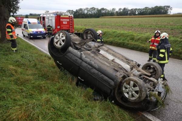 Buchkirchen: Autoüberschlag - PKW bei Verkehrsunfall am Dach liegend zum Stillstand gekommen