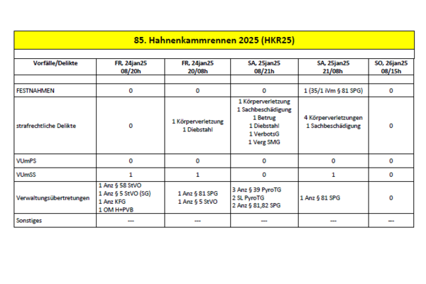 "Die Polizei hat sich intensiv auf diesen Einsatz vorbereitet. Insgesamt war das Rennwochenende ein friedlicher und sicherer Sportevent. Vielen Dank an alle eingesetzten Sicherheitskräfte, die einen wertvollen Beitrag für ein gelungenes Hahnenkammwochenende in Kitzbühel geleistet haben", sagte Landespolizeidirektor Helmut Tomac.