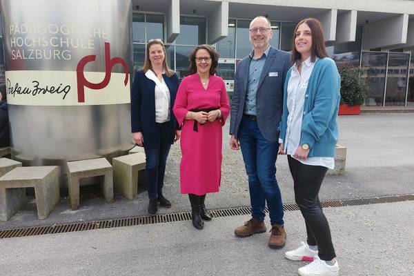 Neue Impulse im Sachunterricht. LR Daniela Gutschi eröffnete die internationale Fachtagung in Salzburg. Mit dabei Daniela Martinek (PH-Rektorin), Christina Egger (Tagungsleitung), Herbert Neureiter (PH)