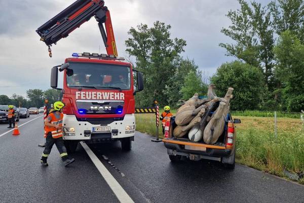 „Bei dem Zusammenstoß eines Pickup-PKW und eines Kastenwagens wurden die beiden Fahrer glücklicherweise nicht verletzt. Auch den geladenen Tieren ging es gut – es handelte sich um Repliken aus Kunststoff“, berichtet Pressesprecher Manfred Ploiner mit einem Augenzwinkern. Während der Pickup, schwer beschädigt, halb in einer Pannenbucht und halb im Straßengraben hing, wurde der Kastenwagen von der Straße geschleudert und kam im nahen Feld zum Stehen.