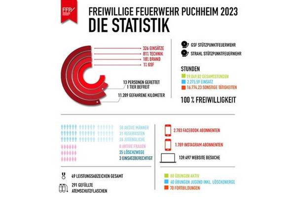 Die Puchheimer Wehr leistete in Summe 9.664,92 Stunden. Alleine 7.688,52 davon wurden freiwillig aufgewendet für Ausbildung und Schulung, Verwaltungstätigkeiten sowie Wartung sämtlicher Gerätschaften und Veranstaltungen. Ein erheblicher Stundenaufwand.