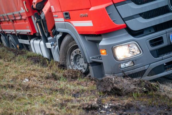 LKW in Eggelsberg im Straßenbankett in Schräglage geraten