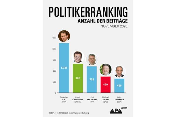Wien (OTS) - Das aktuelle APA-Comm-Politikerranking, das laufend die Berichterstattung von 15 österreichischen Tageszeitungen analysiert, weist für November 2020 Bundeskanzler Sebastian Kurz (ÖVP) als den medial präsentesten Politiker Österreichs aus. In einem bewegten Monat führt Kurz das Ranking mit 1.335 Beiträgen vor Gesundheitsminister Rudolf Anschober (Die Grünen, 765 Beiträge) und Innenminister Karl Nehammer (ÖVP, 708 Beiträge) deutlich an. Die Ränge vier und fünf belegen Wiens Bürgermeister Michael Ludwig (SPÖ, 450 Beiträge) sowie Bildungsminister Heinz Faßmann (ÖVP, 400 Beiträge).