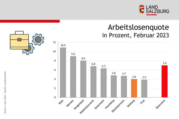 Auch wenn die mit Ende Februar 11.495 Personen ohne Arbeit eine leichte Erhöhung von 220 Personen gegenüber dem Vorjahr sind: Salzburgs Arbeitsmarkt bleibt stabil und liegt österreichweit bei der Arbeitslosenquote im absoluten Spitzenfeld auf Rang 2, nur 0,1 Prozent hinter Tirol.