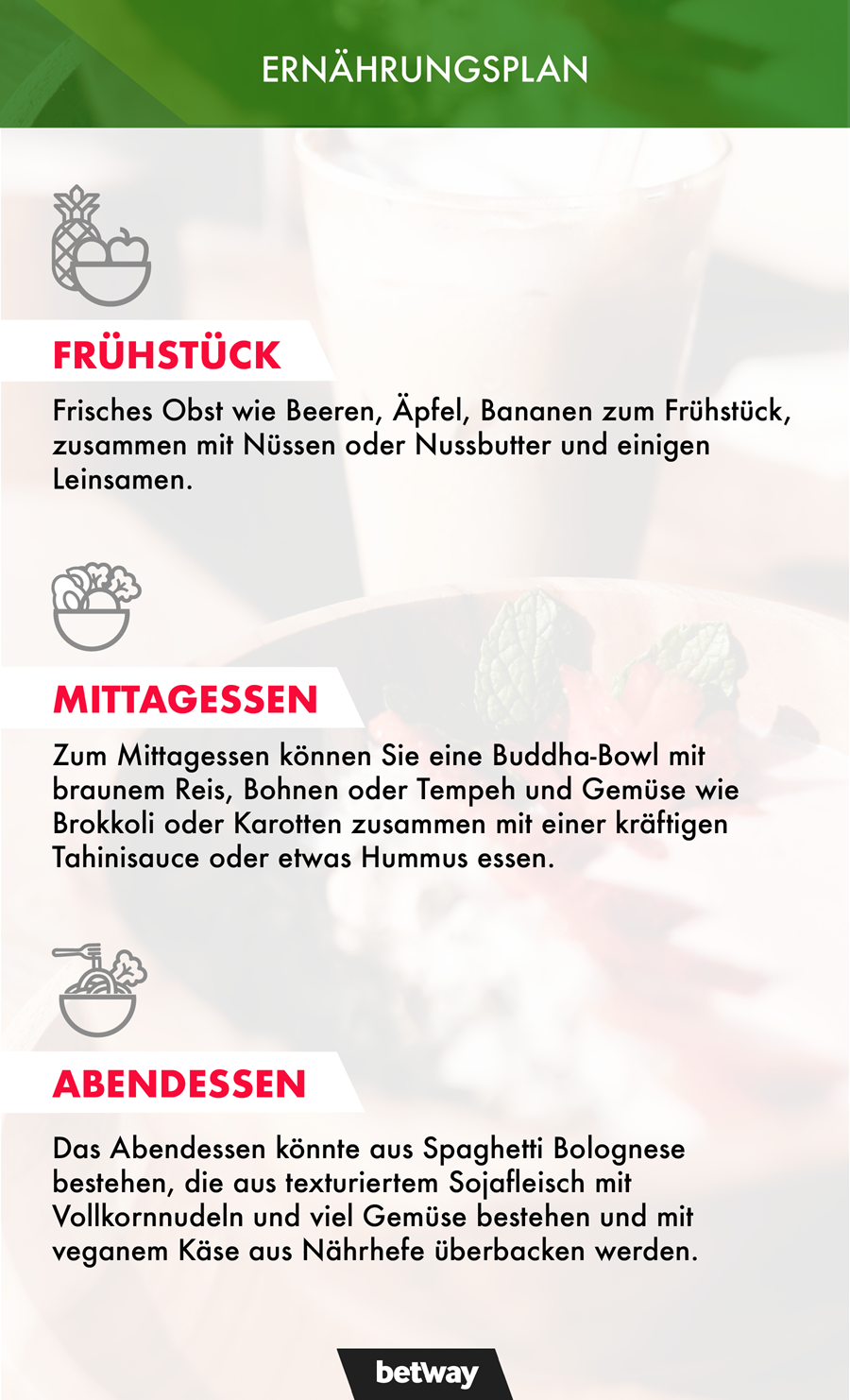 Auch der deutsche Fußball-Nationalspieler Serge Gnabry ernährte sich im Jahr 2019 mehrere Monate fleischlos. Dies sorgte in seinem Heimatland für rege Diskussionen über den Zusammenhang von Sport und veganer Ernährung. Fakt ist, dass der Verzehr von Fleisch nicht notwendig ist, um den Körper mit Proteinen zu versorgen. Denn auch pflanzliche Lebensmittel wie Nüsse, Samen und Vollkornprodukte enthalten in größeren Mengen Eiweiß. Für den Blog von Betway Online Wetten hat der Ernährungsexperte Axel Schurawlow einen Speiseplan erstellt, der veranschaulicht, wie Sportler auf tierische Lebensmittel verzichten und sich trotzdem ausgewogen ernähren können.