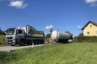 Ein Sattelzug war im Zuge einer Schotteranlieferung über Böschung gerutscht und umgestürzt. Der Fahrer konnte das Führerhaus zuvor verlassen.